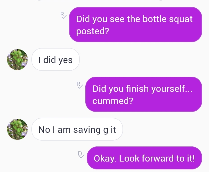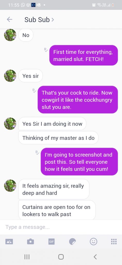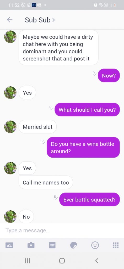 Instrct me : Whatever you like sirInstrct me : Abuse my pussy its yours for tinightMe : Dont be so shyMe : Tell me what you have!Instrct me : Apples bananas carrots remoes cans bottlesMe : Ever sent pics?Instrct me : NoMe : Wine bottleInstrct me : First time abusing my pussyMe : Did you squirt?Instrct me : YesMe : Will you photo pussy squat on wine bottle neck for me?Me : Headless non identifiable pic!Instrct me : OkInstrct me : Deep?Me : Good girl Sophia!Me : Let’s see the neckMe : Squat or kneelInstrct me : It wont sendMe : Really not done “instructions” before?Me : Okay.Instrct me : Yes but it wont sendMe : Imgbb.comMe : Can upload thereMe : If you are feeling dirty enoughMe : Ride the bottle neck slowly for a minuteMe : Still here?